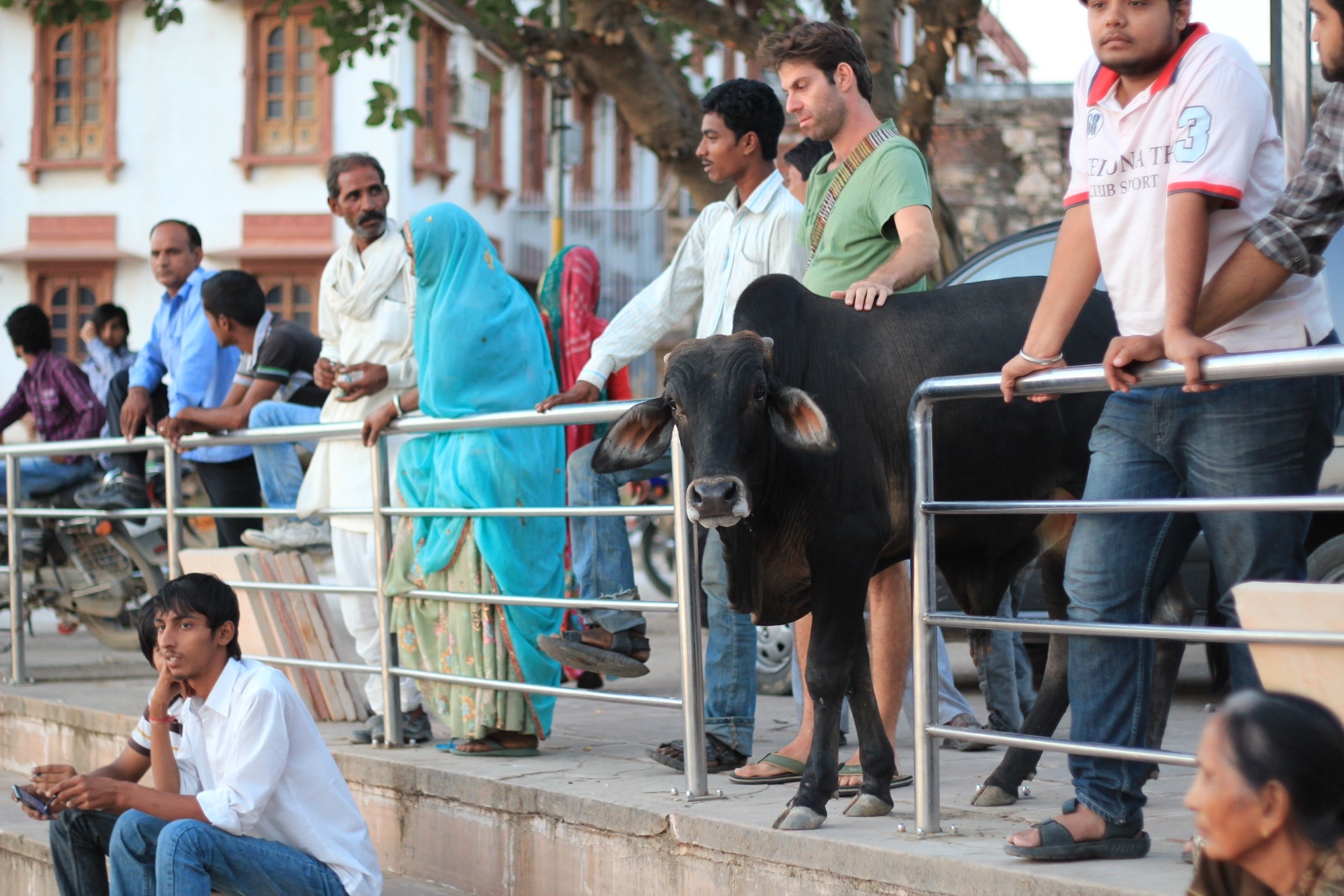 There are sacred cows everywhere here in Pushkar. In this town all meat and alcohol are banned, public displays of affection are taboo and people are encouraged to dress modestly. With the exception of the meat part it sounds like the typical Republican primary voter’s idea of utopia. I have noticed however that the sacredness of cows ends where the vegetable market begins, as I saw elderly women in gleaming, polychromatic saris whacking cows with large sticks when they tried to eat their produce. I love how the sacred cow below decided to take in the sunset with the tourists and locals.