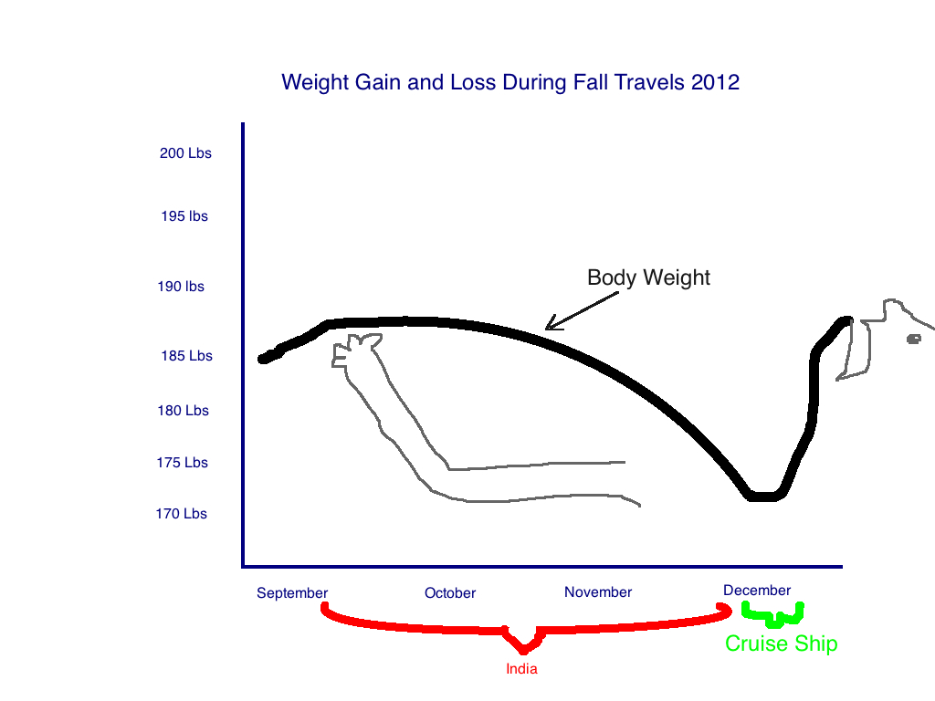 In eight weeks in India, I lost eight pounds. I ate mostly vegetarian meals of hearty curries made from fresh, organic vegetables and fiber-filled whole wheat bread. I ate some rice, some fruit and some deep-fried snacks like samosas. I drank beer here and there. I still lost a pound a week.