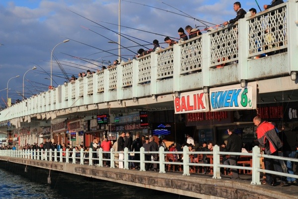 The Galata Bridge is the place to be at sunset. Along the bottom of the bridge are bars, restaurants and hookah lounges, while on top anglers are packed together casting their lines into the sea. Tourists, families and local commuters are buzzing around, creating an exciting energy.