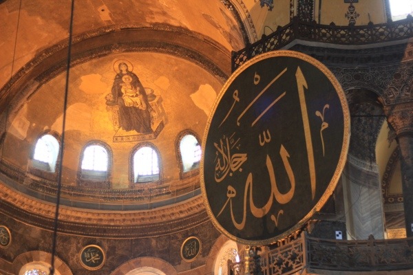 20131008-103329.jpg The Aya Sofya interior. It was first a church, then a mosque and now a museum. On the top of the dome you see a mosaic of Mary with baby Jesus, juxtaposed by the Muslim medallions in Arabic script.