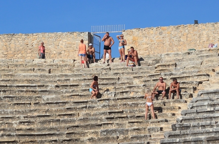 Hierapolis, the ruined Roman city atop the terraces, might have been the original spa town. For thousands of years, people have traveled here to bathe in the mineral waters. Today, the ruins are an afterthought for most visitors who come to party in the pools. I think Hierapolis is okay with that. What other ruins do people visit in bikinis and swimsuits? Where else do men walk around shirtless and girls pose for photos in ancient amphitheaters while wearing next to nothing? Nearby Efes may be more renowned, the forum in Rome might have more history, but Hierapolis is the cool kid of ruins.
