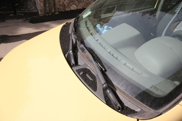 One complication, he said, is that the rocky debris on the cars simply cannot be moved off with the windshield wipers because it scratches the glass and paint. This was pretty obvious when I looked at cars today with tiny bits of volcanic gravel piled in the base of the windshield or atop the wipers. The only way to clean the car, it seems, would be to turn it upside down and dump it out. As small as these cars are, that wouldn’t be that hard.