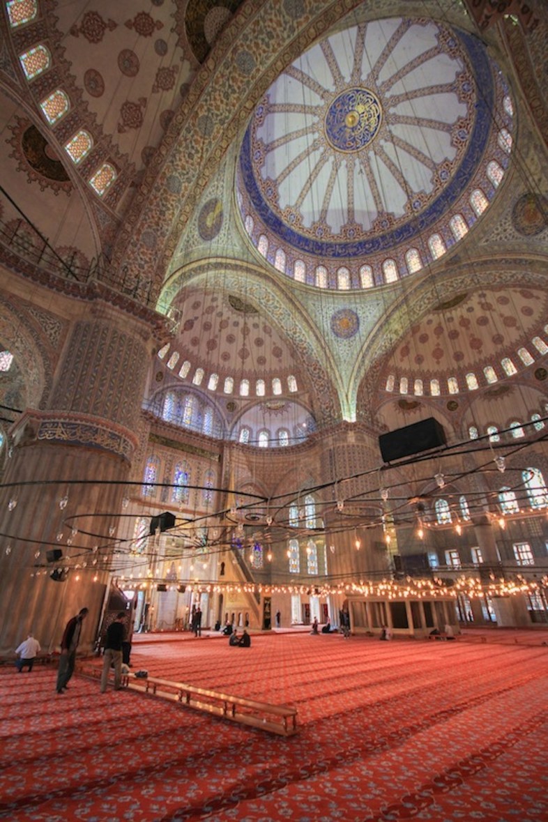 The 10mm lens greatly distorts the interior of the Blue Mosque. Lights are suspended from the ornate ceiling and worshipers take a place on the carpet for prayers.