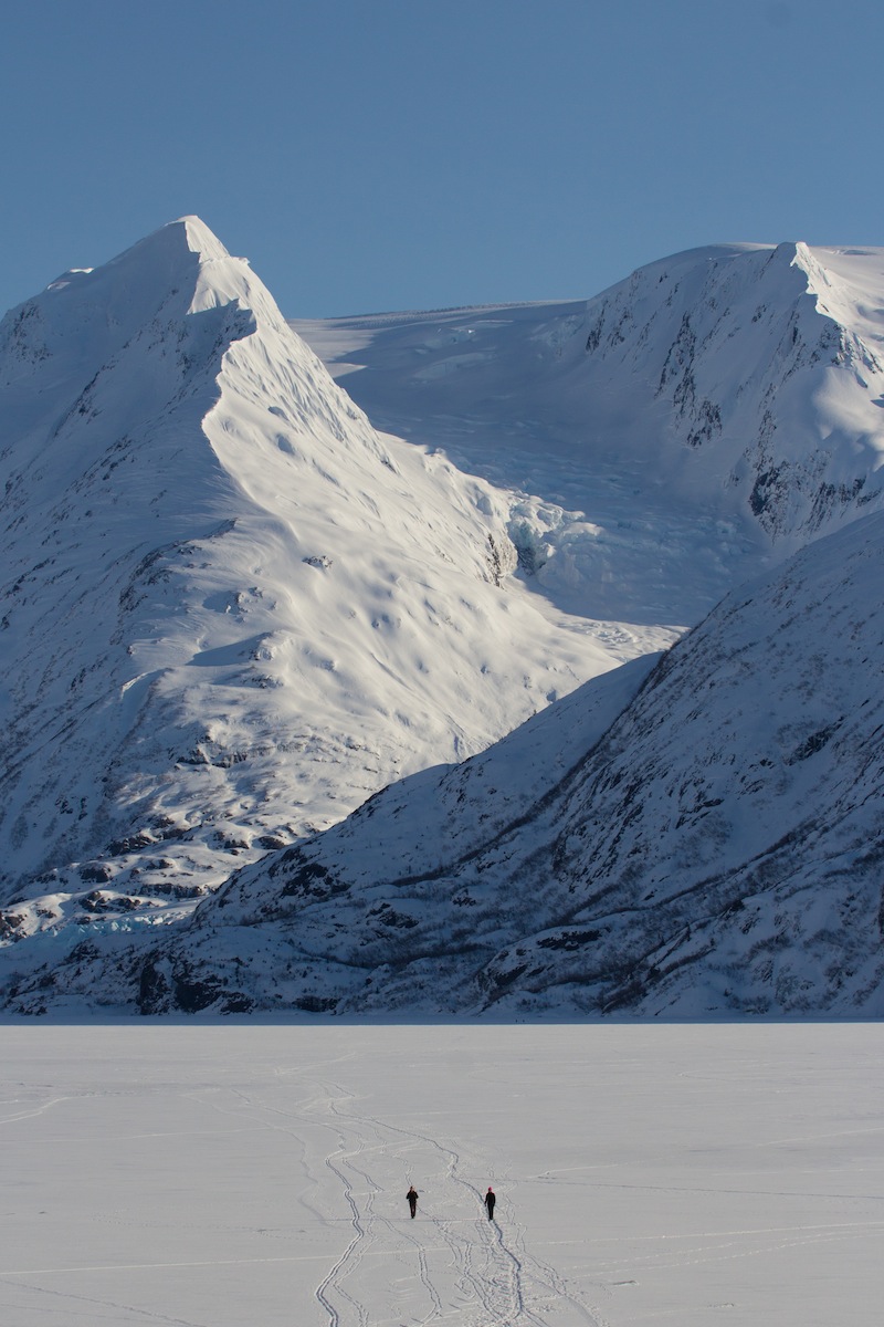 Portage Glacier is in the corner of Portage Lake about an hours drive from Anchorage. The glacier is tucked around the bend of a mountain, and isn’t visible during the walk across the lake. Atop the lake was a layer of snow with a straight trail packed hard by walkers, cross country skiers, dogs, sleds and bikes.
