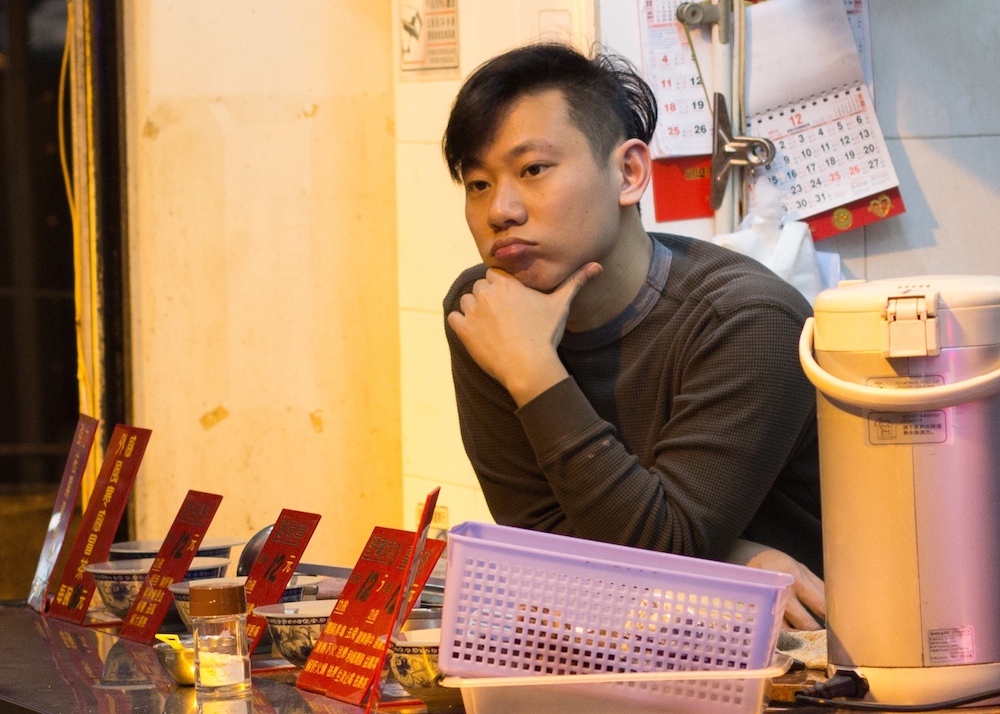 Hong Kong street photography August 8, 2015 1000 × 714 Contemplating life while waiting for a customer.