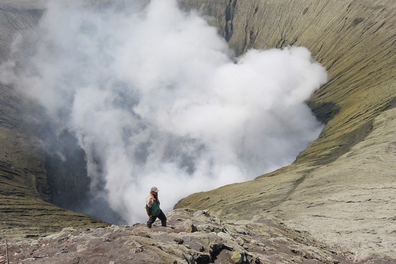 And then something happened that I can only assume pissed it off even more. A man, who obviously values a few Rupiah more than his life, hiked down the steep slopes of scree and began collecting coins given as an offering to the volcano. He was stealing from the angry volcano, something that I did not view as a smart move. I expected the volcano to rumble to life, causing an earthquake that would send him tumbling into the smoking abyss or melt him with spewing lava.