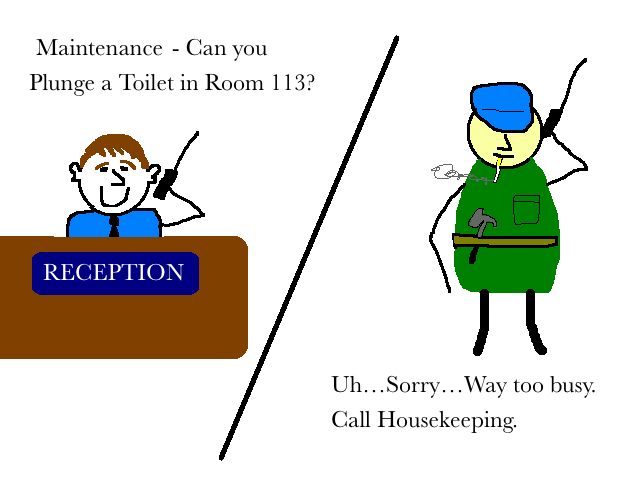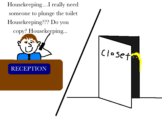 Some people do want to deal with their own crap, so to speak, and take the plunger and do it themselves. Some are terribly embarrassed and leave the room after calling reception so they aren’t there when someone comes. Then there are awkward people who stay…