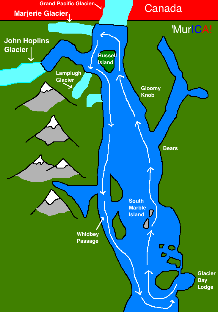 On the left you can clearly see the clean and brilliant Marjerie Glacier. It is in America. On the right, you notice what looks like a bunch of dirt. That is actually the Grand Pacific Glacier in Canada. Canada doesn’t take very good care of its glaciers.