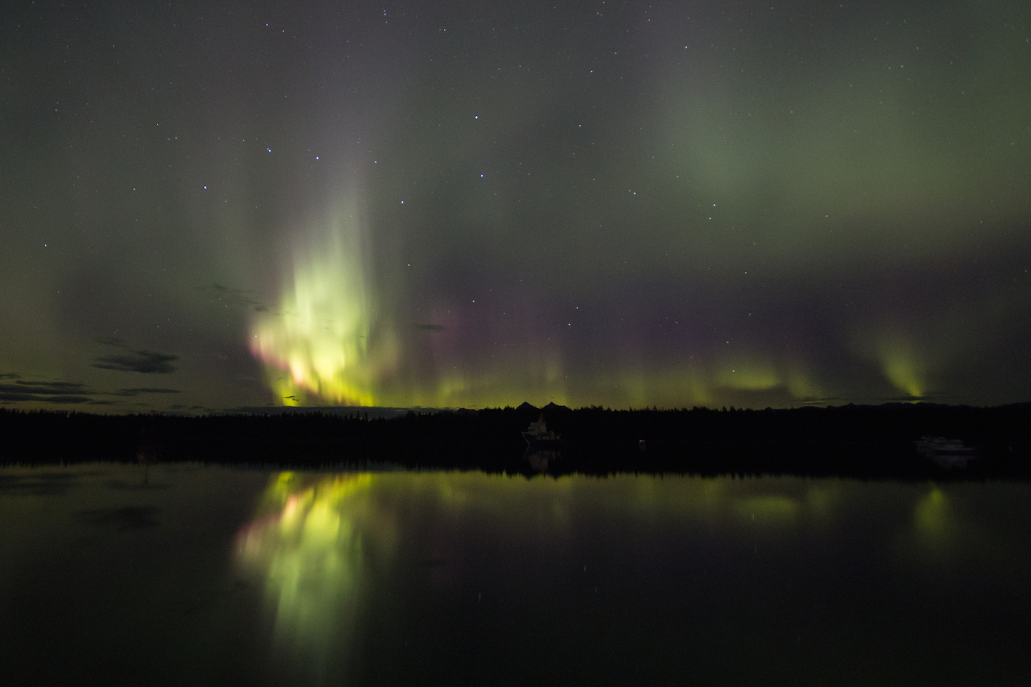 For several hours, the northern lights danced around, setting the northern sky ablaze. It was an above average northern lights show, and I got some decent photos with the lights reflecting slightly in the water. I felt a deep sense of awe watching them, and a sense of victory – I got to see the lights this year! – something that isn’t necessarily guaranteed. Little did I know that the best was yet to come.