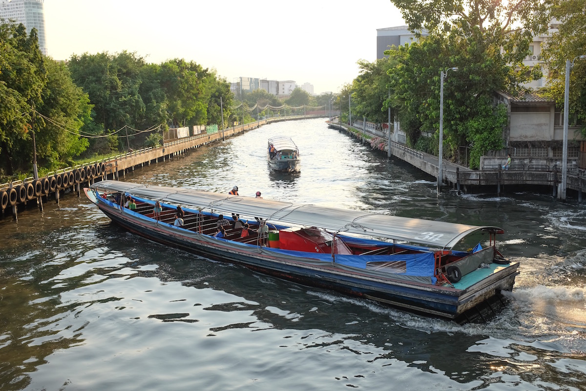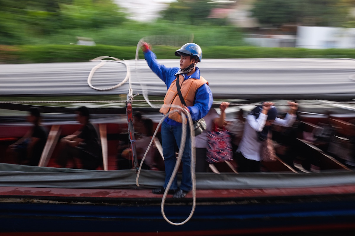 The khlong works a lot like the bus – as the speeding boat approaches a stop, the driver shuts off the engine and pulls the boat parallel to the pier as a ticket-taker/boat-cowboy lassos a metal pole and ties the boat to the dock. At this time, disembarking passengers step over a tarp and onto a narrow wooden ledge while ducking under the roof before leaping to safety on dry land, while embarking passengers fold themselves in half and squeeze under the roof and step over the various trip hazards before plopping onto the wooden bench or another passenger, whichever comes first. All of this takes place as the boat rocks violently from its own wake. Meanwhile, the passengers seated on the narrow wooden benches shuffle from side to side to allow space for the new arrivals. Note: the boat is never too full – there is always room to cram one more person in each row.