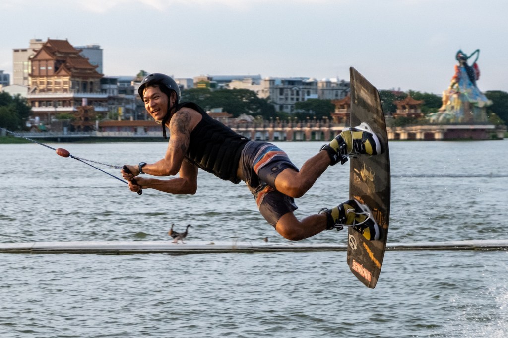 The serene Tiger and Dragon Pagodas sit incongruously next to a raucous wakeboard park. If you want to watch a mix of experts do gnarly tricks and beginners crash and burn, get a beer at the lakeside bar and kick back for some free entertainment.